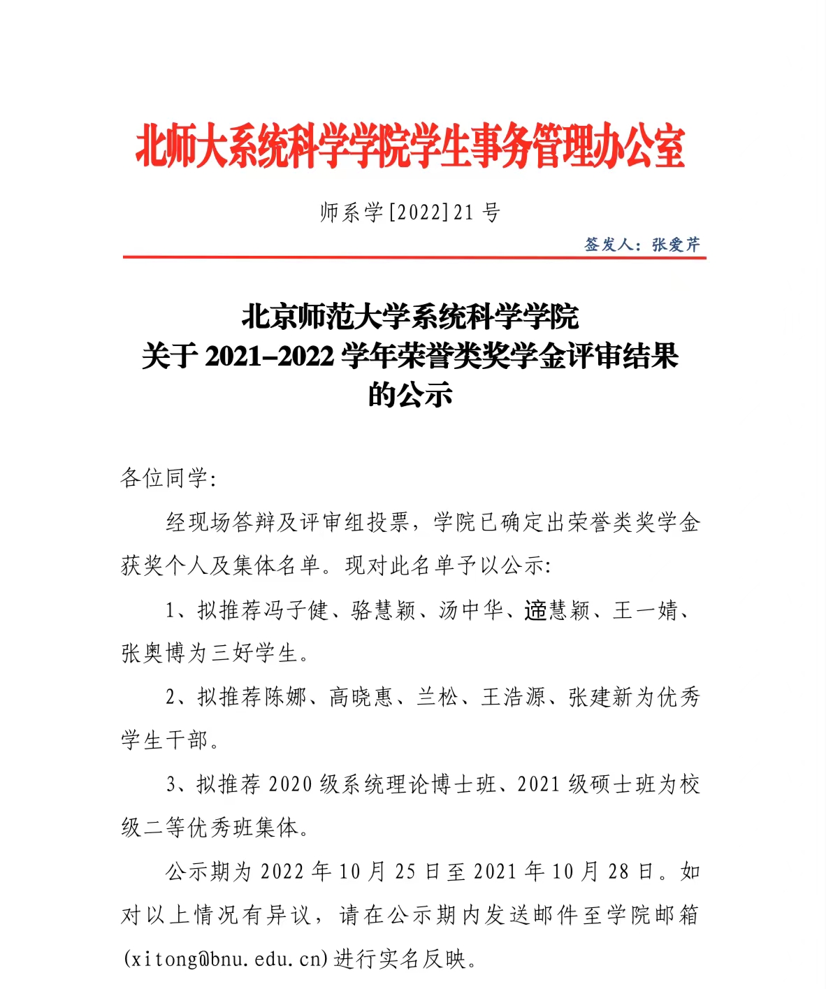 关于2021-2022学年荣誉类奖学金评审结果的公示