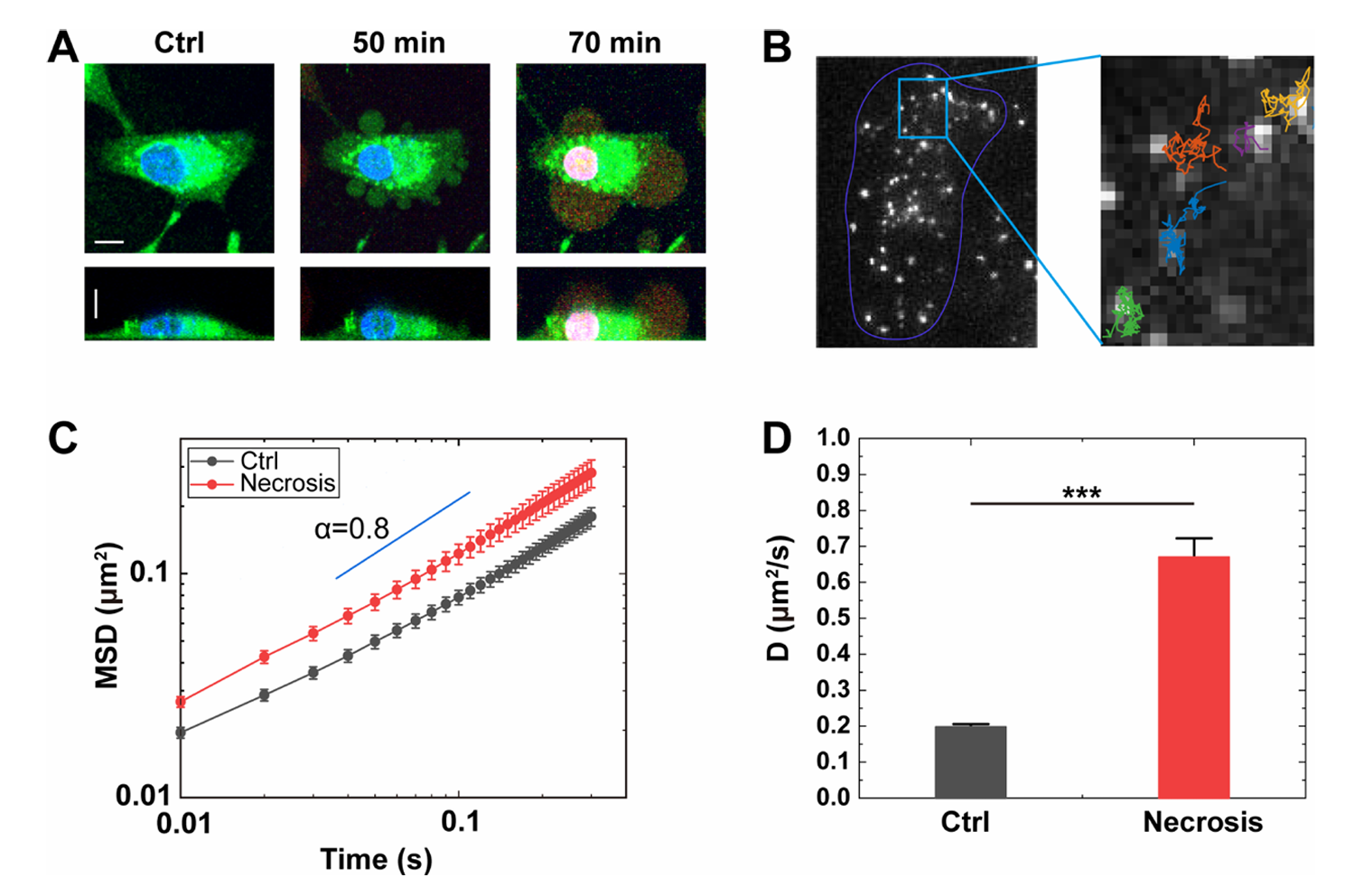 细胞死亡是生物体维持稳态和应对损伤的关键生物学过程,具有多种模式。其中,凋亡和坏死是两种最为人熟知的细胞死亡方式。凋亡作为一种程序性的细胞自我毁灭过程,对于发育、免疫反应以及去除受损细胞至关重要;相对于凋亡的有序性,坏死传统上被认为是一种无序且被动的细胞死亡方式,通常与急性细胞损伤相关。然而,近期的研究发现,坏死并非完全无序,它同样受到特定生物学信号通路的调控。但是,细胞坏死过程的内部动力学及结构变化尚不清楚。