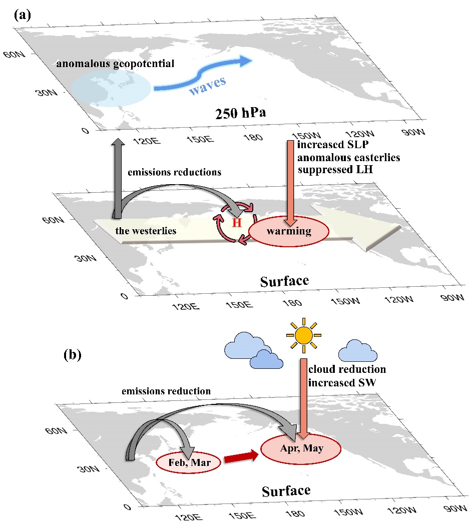 图2:图示了2020年春季疫情期间气溶胶减排影响东北太平洋热浪的机制,(a)展示了气溶胶减排通过影响罗斯比波列(Rossby wave train)增加到达海洋表面的潜热通量(latent heat flux);(b)展示了气溶胶-云相互作用影响海洋表面短波辐射的情况。潜热通量用LH表示,SLP代表海平面气压,SW代表短波辐射。