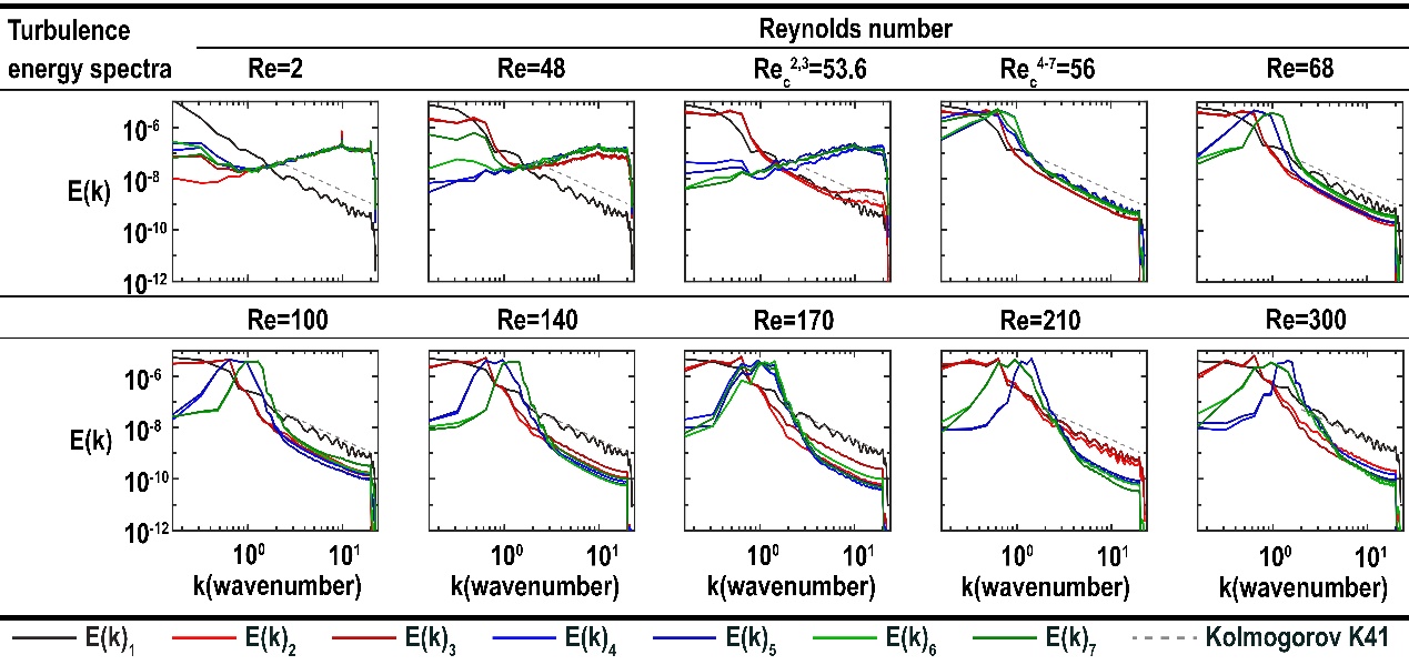 图3:不同雷诺数速度本征微观态的能谱关系。不同本征微观态用不同的颜色表示,灰色虚线代表柯尔莫哥洛夫的K41理论,斜率为-5/3。