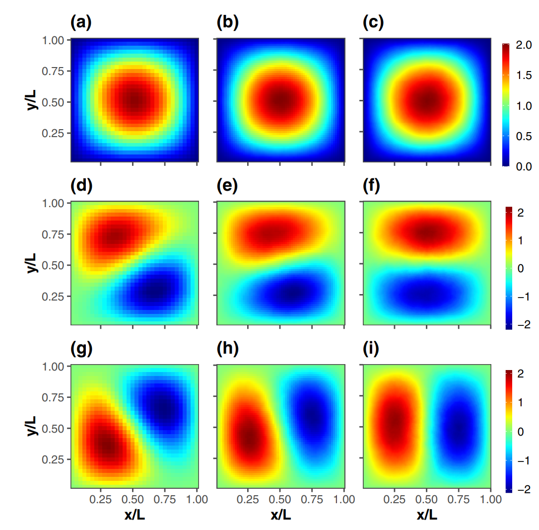 图2. BTW模型临界态的本征微观态标度空间分布。第一大本征微观态展示在(a)-(c),分别对应尺度L=32,64和128, 第二大本征微观态展示在(d)-(f),第三大本征微观态展示在(g)-(i)。