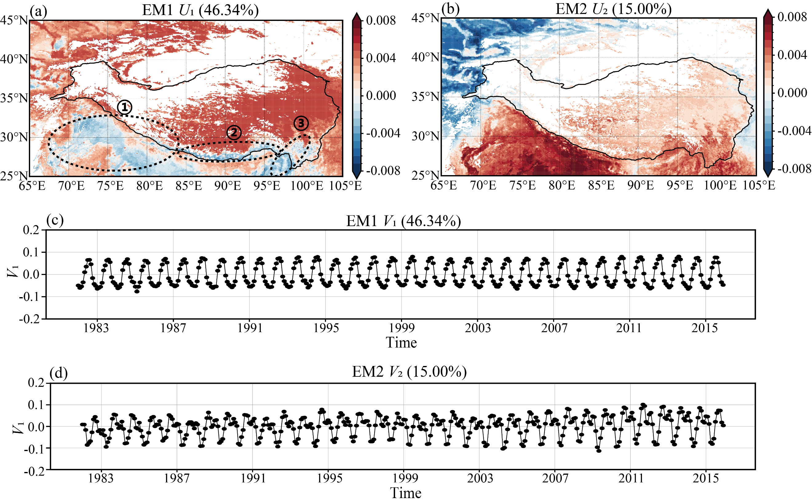 图1 青藏高原及其周围区域NDVI前两大本征微观态的空间模式和时间演化。(a)、(b) 空间模式,(c)、(d) 时间演化。