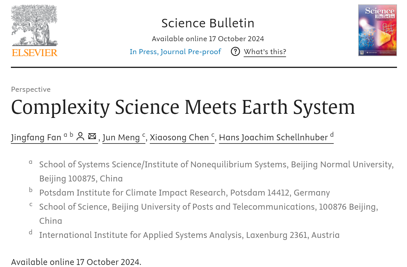 近日,色情直播app 樊京芳教授的最新观点论文《Complexity science meets Earth system》在线发表于Science Bulletin,该期刊为国际知名综合类学术期刊,影响因子为18.9。此研究为系统科学在地球系统研究中的应用提供了全新视角。该研究由北京师范大学、北京邮电大学和奥地利国际应用系统分析研究所等多家研究机构联手完成,其中色情直播app 樊京芳教授为论文第一作者和通讯作者。论文的合作者包括孟君研究员、陈晓松教授以及Hans Joachim Schellnhuber教授。