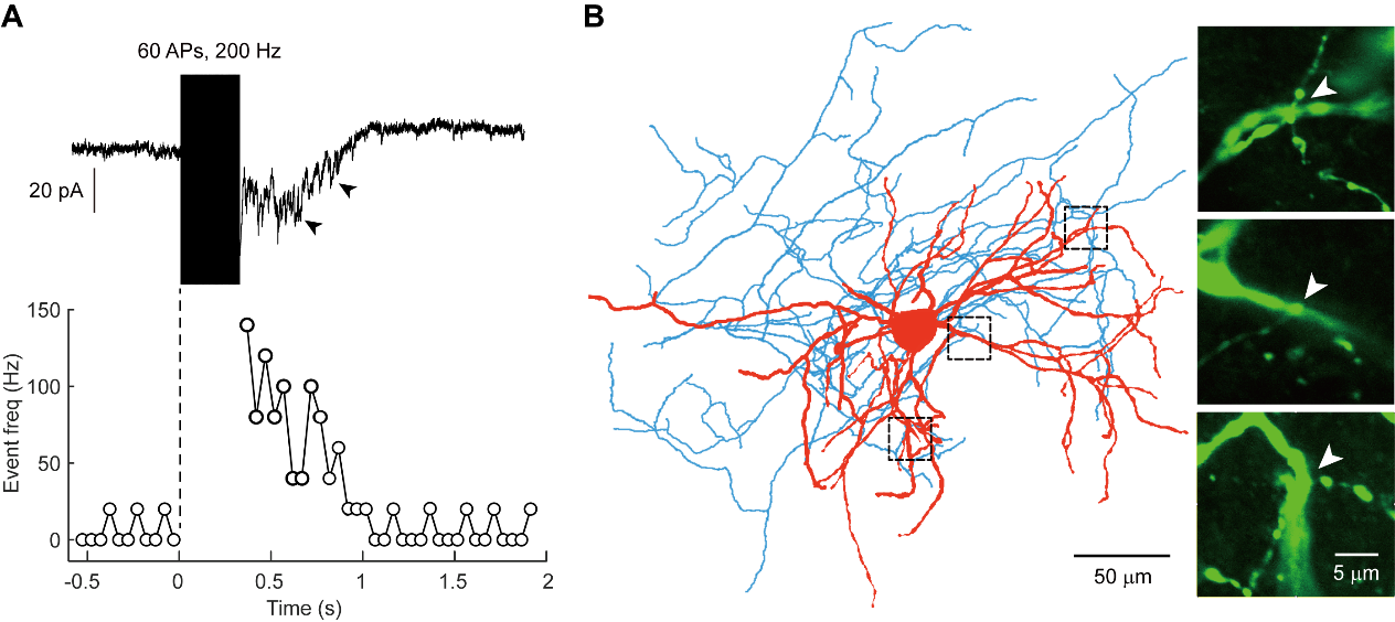 近期,色情直播app 王大辉教授团队博士生王轩与复旦大学脑科学转化研究院舒友生教授团队合作,结合神经科学的实验技术和神经系统的计算模拟,对纹状体神经元的自突触进行了深入探索。在急性分离的小鼠脑片上,研究人员对纹状体神经元进行全细胞记录,利用动作电位高频爆发后自突触上延迟出现的神经递质非同步化释放(asynchronous release, AR)现象来识别记录的神经元是否具有功能性自突触。惊讶的是,所有记录到的SPN在动作电位爆发后都没有自突触的AR现象,即使是在细胞外液中存在促进AR的锶离子(Sr2+)的情况下也没有出现AR,提示SPN并没有发育出自突触结构。相反,在另一类纹状体神经元,即小清蛋白(Parvalbumin,PV)阳性的中间神经元上,我们在约半数的记录细胞中观察到了稳定的自突触AR事件(附图A),同时在形态学上也观察到了可能的自突触位点(附图B)。