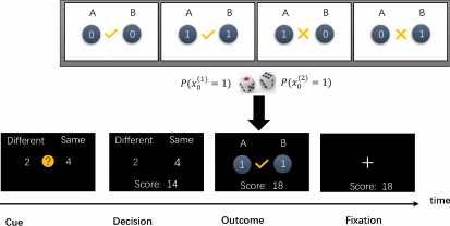 图 1:二维二值波动环境中的博弈任务:任务包含四个阶段。 (1) 线索提示(Cue):两个选项及其选对时的分数奖励被呈现; (2) 决策(Decision):一旦博弈者做出了选择, 所选择的选项将会以放大高亮方式呈现;(3) 输出结果(Outcome):两个臂随机生成它们各自的状态, 同时输出博弈者决策的结果。如果博弈者的选择是正确的,当前得分奖励加入总分中; 如果博弈者选错则不得奖励分,其总分值保持不变。 (4) 注意(Fixation):这是两个试次之间的短暂休息。屏幕仅呈现当前博弈者的得分数,直到下次试次开始。
