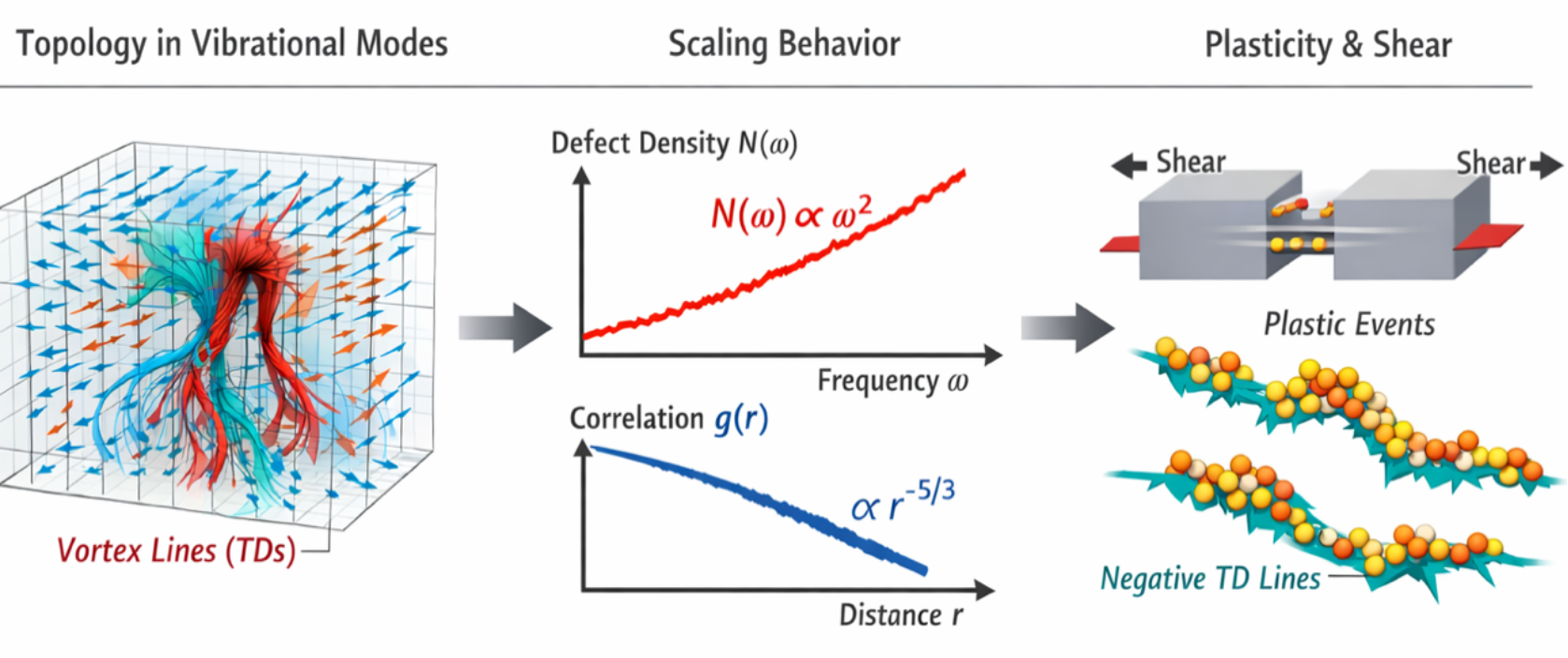 Graphical abstract:从“只看振动态密度”转向“看本征模本身的几何与拓扑”,并通过相位绕数识别三维中的拓扑缺陷,这些缺陷并非零散“点”,而是准一维的涡旋线,在空间中形成特定几何结构。玻璃的塑性重排并非局部随机,而是被低频本征模的拓扑几何所“预编程”。(图片借助生成式人工智能制作产生)