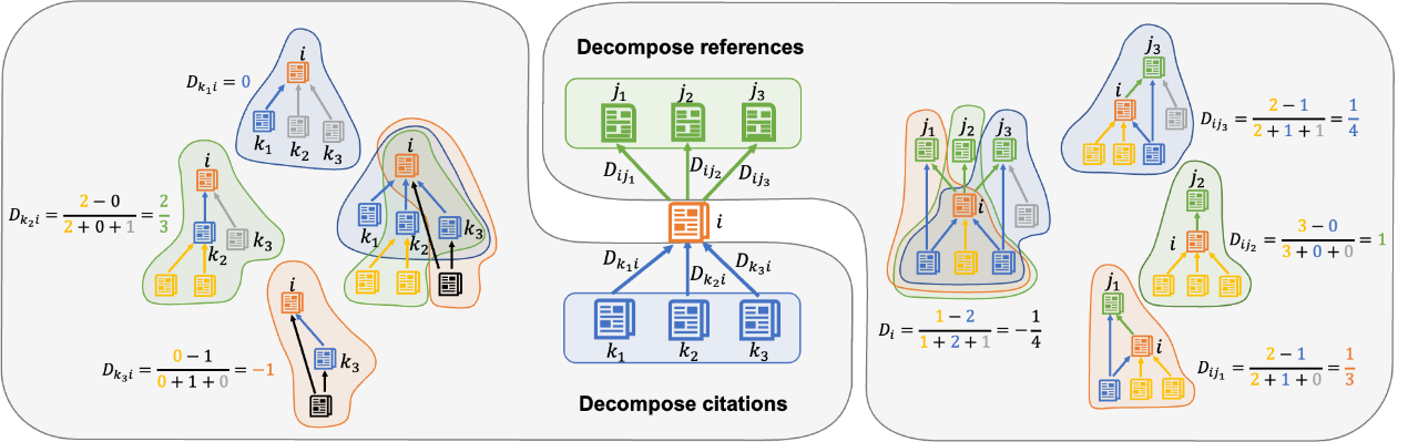 图 1,基于引文网络的“引用颠覆性”与“被引颠覆性”概念框架,聚焦论文i与其参考文献(j1-j3)和引用论文(k1-k3)的交互关系。与传统整体颠覆性指标不同,本研究通过解构每一条引用链接(右图:基于参考文献j的子网络分解,量化论文i对单个前人研究的颠覆程度;左图:基于引用论文k的子网络分解,评估后续研究对论文i的颠覆性影响)。本框架首次实现从双向维度精确测量论文的颠覆性传播与持久性特征。