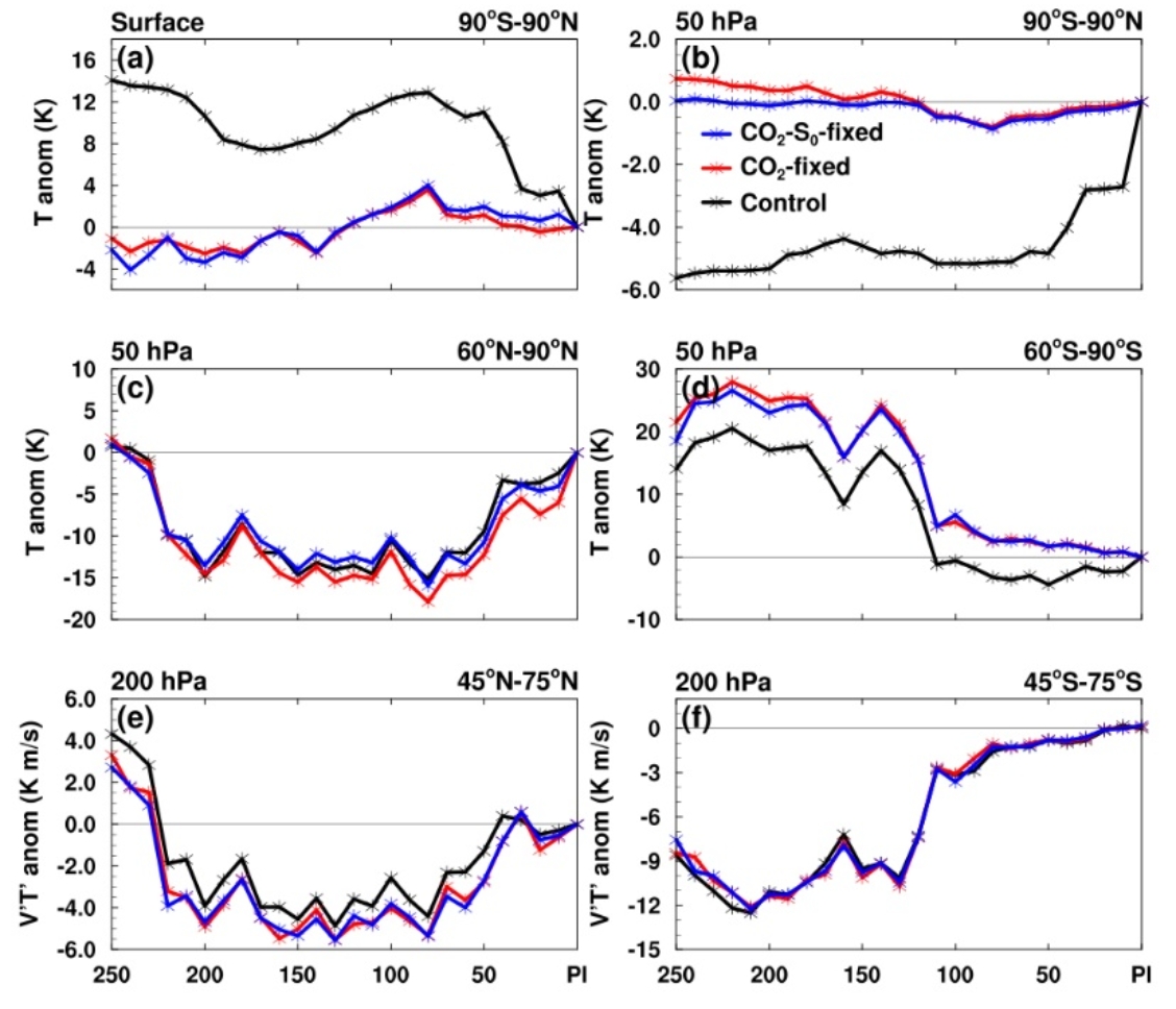 图1 2.5亿年来(a),(b)全球平均地表和平流层温度、(c),(d)南北半球极区平流层温度、和(e),(f)南北半球200hPa涡动热量通量异常的演变。