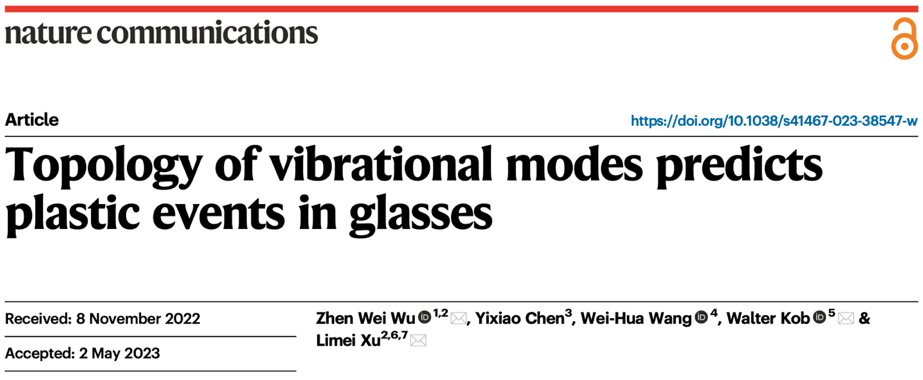 2023年5月24日,色情直播app 、非平衡系统研究所武振伟副教授及其合作者,北京大学元培学院陈一潇(普林斯顿大学博士研究生),中科院物理所汪卫华院士,法国蒙彼利埃大学Walter Kob教授,以及北京大学物理学院徐莉梅教授,关于玻璃态物质振动模式中拓扑缺陷与塑性事件关系的研究工作,以“Topology of vibrational modes predicts plastic events in glasses”为题在线发表于国际学术期刊《Nature Communications》。