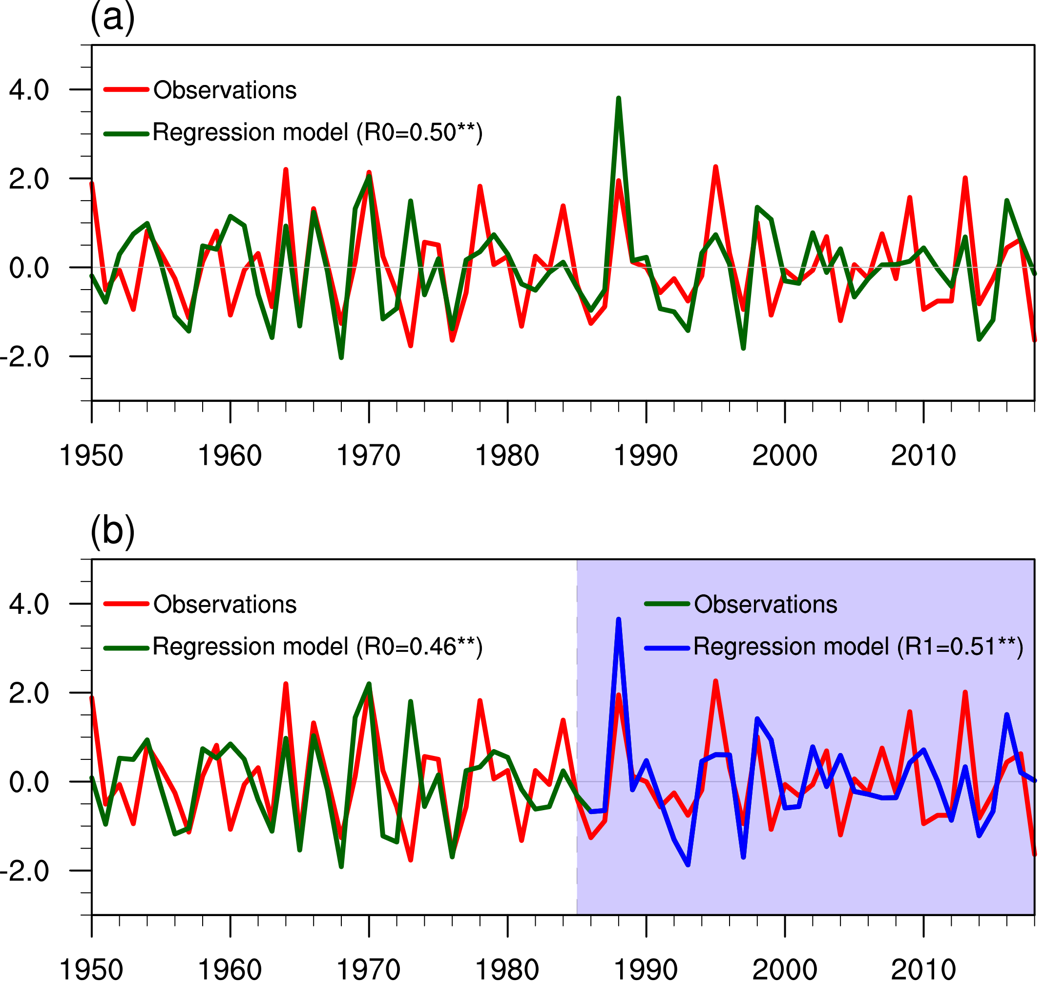 图3:(a) 1950-2018年,西北太平洋9-10月去趋势后的TC年际频率的标准化时间序列(红线)和线性拟合的热带气旋生成频次(绿线)。拟合的TC频率是基于2 -3月HWPI和1-2月Vicotria指数线性拟合的。(b)与(a)类似,但1950-1985年用于建立线性回归模型,1986-2018年用于检验模型的稳定性,其中,拟合和预测的热带气旋生成频次分别用绿线和蓝线表示。