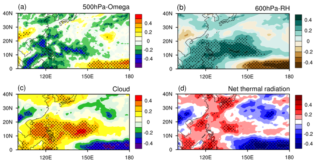 图2: 2-3月HWPI去趋势后的年际变化与9-10月各种气象要素之间的相关系数。(a)500 hPa的垂直速度,(c)600 hPa的相对湿度,(e)总云量,(g)地表净的热辐射通量(向下为正)。打点的区域表示相关系数通过了95% 的显著性检验。