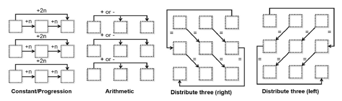 瑞文智力测验(Raven's Progressive Matrices)是经典的抽象视觉推理任务,用于测量人类的流体智力和高级推理功能。近年来,研究人员开始利用AI来解决RPM问题。朱松纯等人提出针对神经网络的RAVEN测验,包括由5种形状,10种颜色,6种大小,8种角度的图形组成的7个不同配置(Center、2*2、3*3、O-IC、O-IG、L-R、U-D)的3*3矩阵问题,要求智能算法在完整的两行中找到共同矩阵的规律,并且运用规律将题目“矩阵”补充完整。