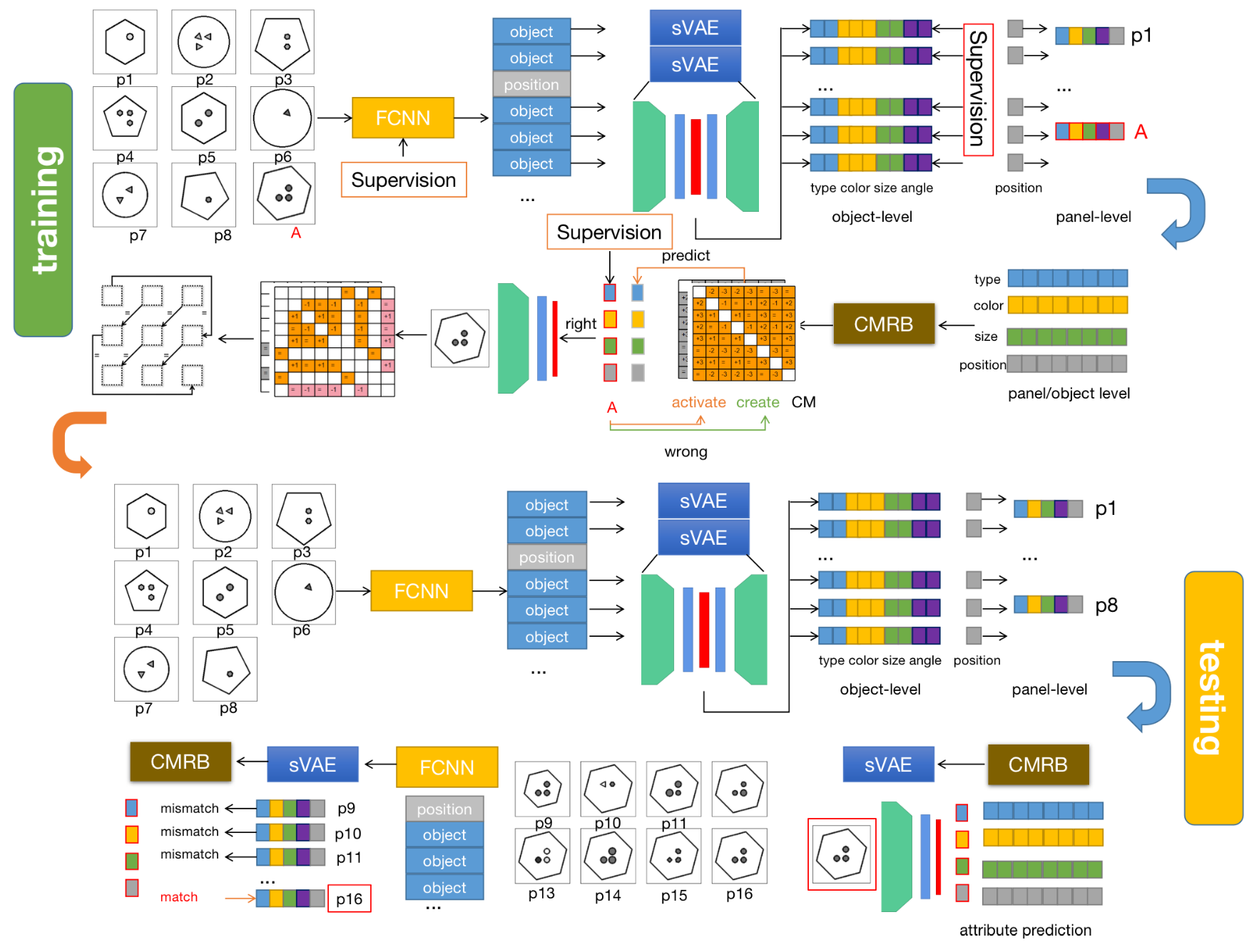 该模型包括语义VAE(sVAE)感知模块和认知地图推理后端(CMRB)。通过引入语义标签,sVAE可以实现对图片的语义编码,将物体解耦到可以理解的语义隐变量维度。CMRB模块遍历训练集中的题目,在抽象语义表征的基础上逐渐编码物体或属性之间的关系,形成针对特定题目的关系图表征并激活经历过的相似关系结构,提取通用的规律,建立可迁移的认知地图。完成训练后,模型根据sVAE对新题目的知觉编码和CMRB的认知地图来预测新题目中缺失位置的物体和属性,可进一步由sVAE根据预测的属性生成符合情景的答案图片。