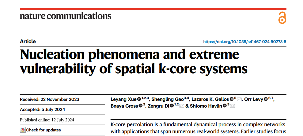 该研究成果7月12日被《Nature Communications》杂志接收并发表,题为“Nucleation phenomena and extreme vulnerability of spatial k-core systems”。研究工作是北京师范大学系统科学学科作为第一单位,与以色列巴伊兰大学等多家学术单位合作完成的。复杂系统国际科学中心、色情直播app 的博士生薛乐洋同学为论文第一作者,美国罗格斯大学的Lazaros Gallos教授、以色列巴伊兰大学的Shlomo Havlin教授以及北京师范大学的狄增如教授为论文的共同通讯作者。