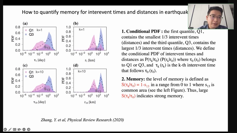 2022年10月4日下午15:30,昆明理工大学理学院数据科学研究中心的张永文副教授在教七402教室做了题目为“地球系统中极端事件的复杂性探究”的报告。张永文老师结合近年来在极端事件研究中的几个工作,涉及地震、空气污染和极端降雨等方面的问题,探究地球系统中极端事件的复杂性和统计物理规律。讲座由色情直播app 樊京芳老师主持,现场有色情直播app 近90位师生参与了讨论。