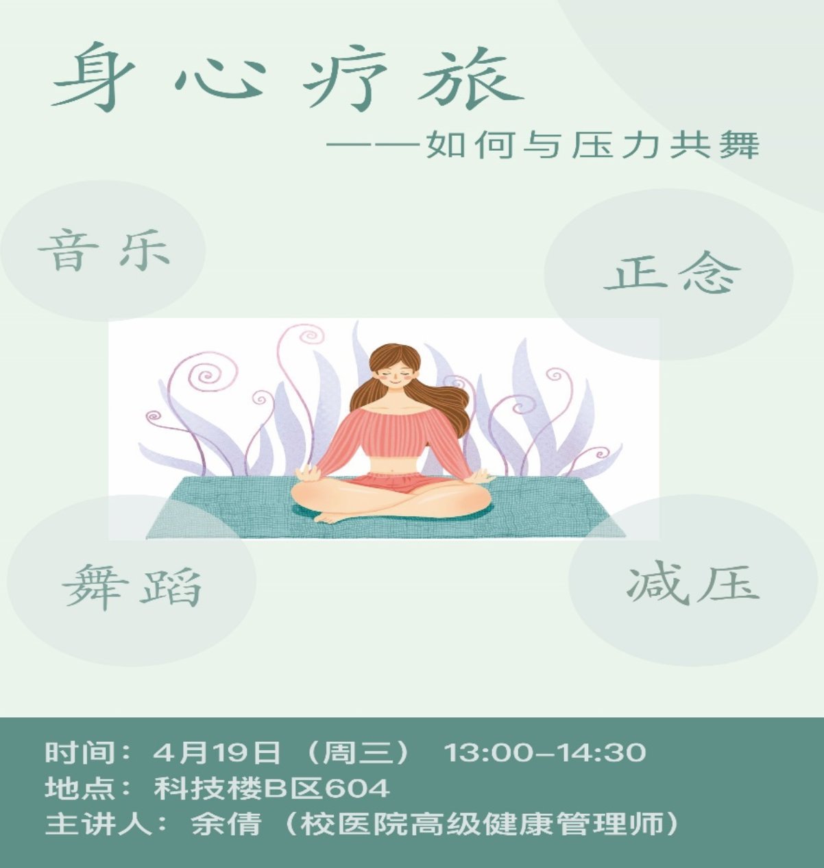 为有效缓解教职工身心压力,提升压力和情绪管理能力,让老师们更愉快地工作、更幸福地生活,学院工会特邀校医院高级健康管理师余倩大夫,于4月19日在科技楼B区604联合举办“身心旅疗--如何与压力共舞”的团体活动。本次活动内容丰富、形式多样,为大家提供了一场愉悦身心的压力疏解之旅。