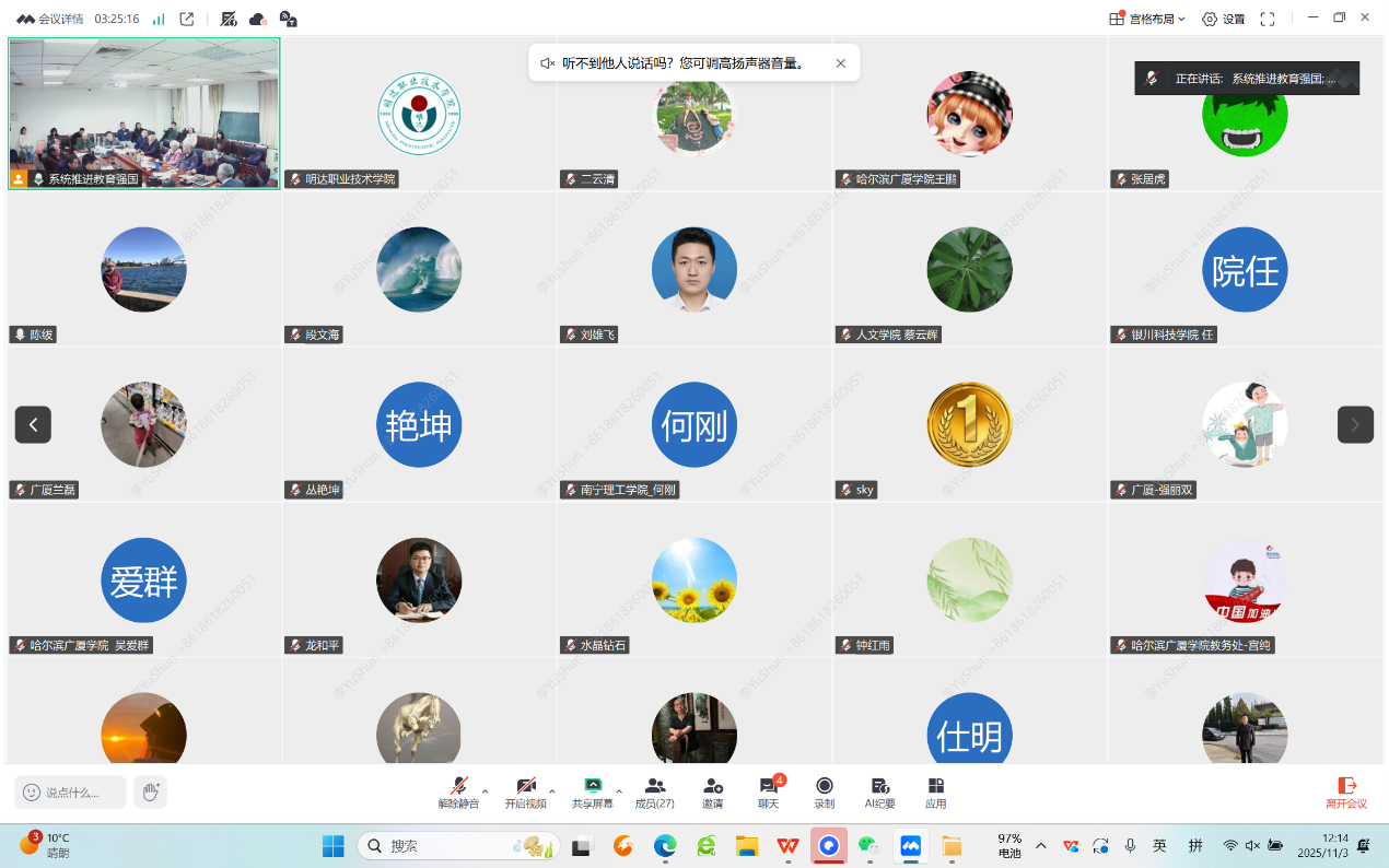 2025年11月3日,由色情直播app 及数字学习与教育公共服务教育部工程研究中心教育系统工程委员会联合主办的“系统推进中国式现代化教育强国”系列讨论第一次活动正式开启,色情直播app 王大辉教授和数字学习与教育公共服务教育部工程研究中心副主任李玉顺教授出席了本次讨论。来自校内外共75名专家学者参与了本次讨论,其中28人线下参加,47名通过腾讯会议线上参加。