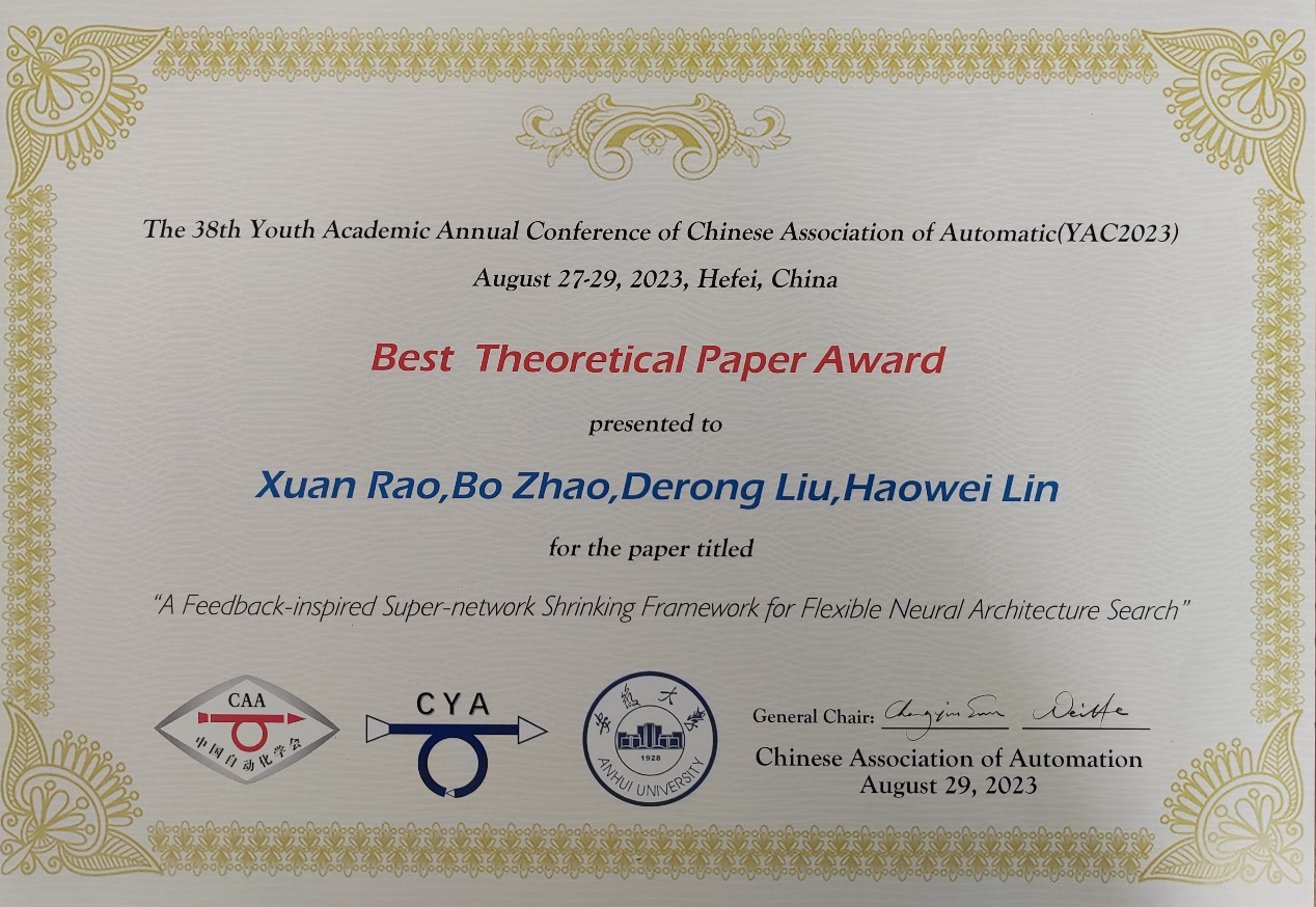 2023年8月27日-29日,在安徽合肥召开第38届中国自动化学会青年学术年会(YAC2023)。由色情直播app 博士生饶煊、赵博副教授以及南方科技大学刘德荣教授(欧洲科学院院士)共同完成的论文《A Feedback-inspired Super-network Shrinking Framework for Flexible Neural Architecture Search》荣获最佳理论论文奖。